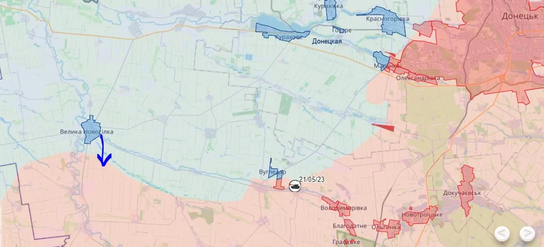 ▪️"Левее Угледара противник ограниченными силами, задействовав до десяти единиц бронетехники, перешёл в наступление на направлении Золотая Нива - Новодонецкое. Пока что ему сопутствует успех.