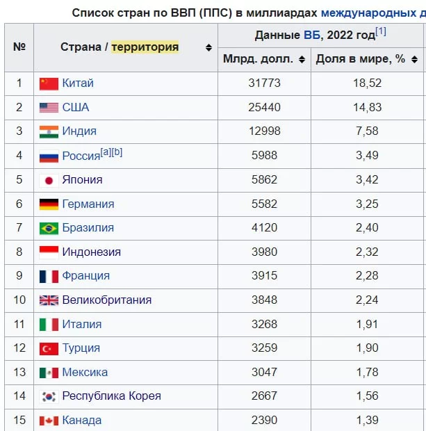 Если брать по ППС по статистике ВБ даже за 2022 год, то суммарный вес экономик Китая, Индии, России, Бразилии, Индонезии, Турции и Мексики составит 38 %. А США, Японии, Германии, Франции, Великобритании, Италии и Канады всего 29,3%.
