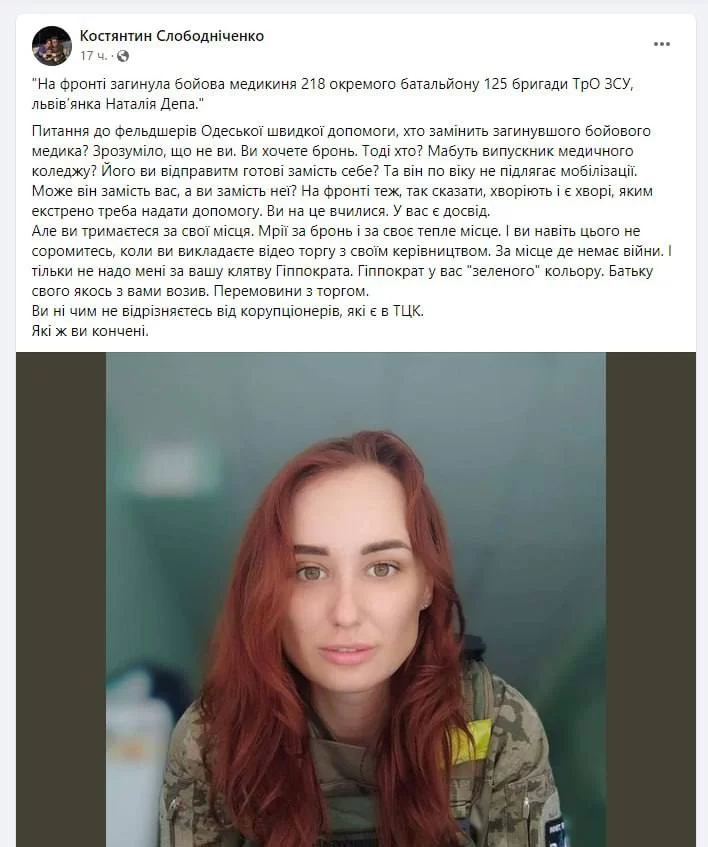В частности, на верхнем скрине ВСУшник укоряет одесских фельдшеров, которые увольняются из-за отсутствия брони, и приводит в пример мужественную Анастасию, которая погибла, защищая незламну. А оно вон как получается. Невдобно трошки выйшло..