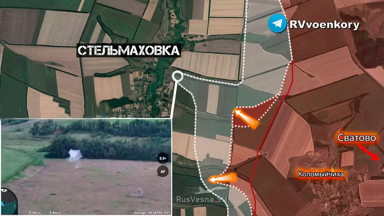 ▪️Сватовское направление. Российские войска при поддержке бронетехники атакуют Стельмаховку с востока. Десант спешился в районе западной части балки и штурмует Стельмаховку и лесополосы южнее балки, постепенно закрепляясь на позициях.