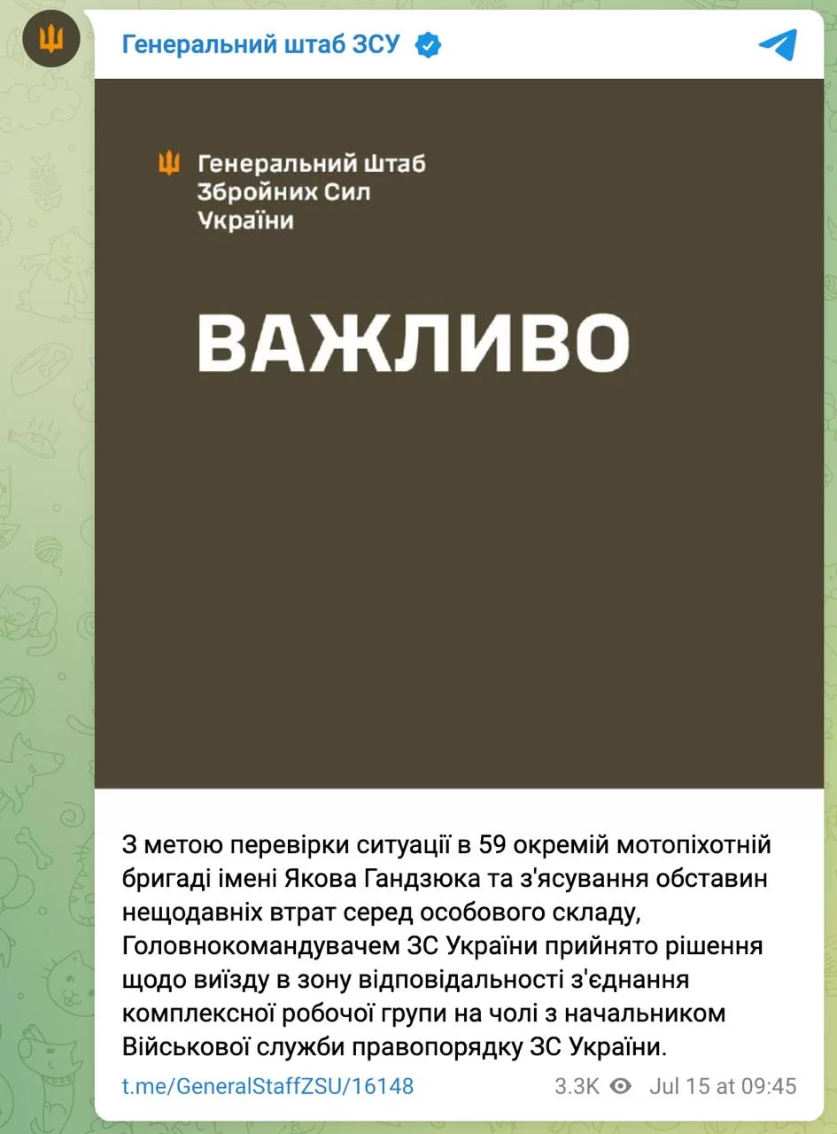 ▪️Главком Сырский направил в 59-ю отдельную мотопехотную бригаду рабочую группу во главе с начальником Военной службы правопорядка «в целях проверки ситуации и выяснения обстоятельств недавних потерь среди личного состава».