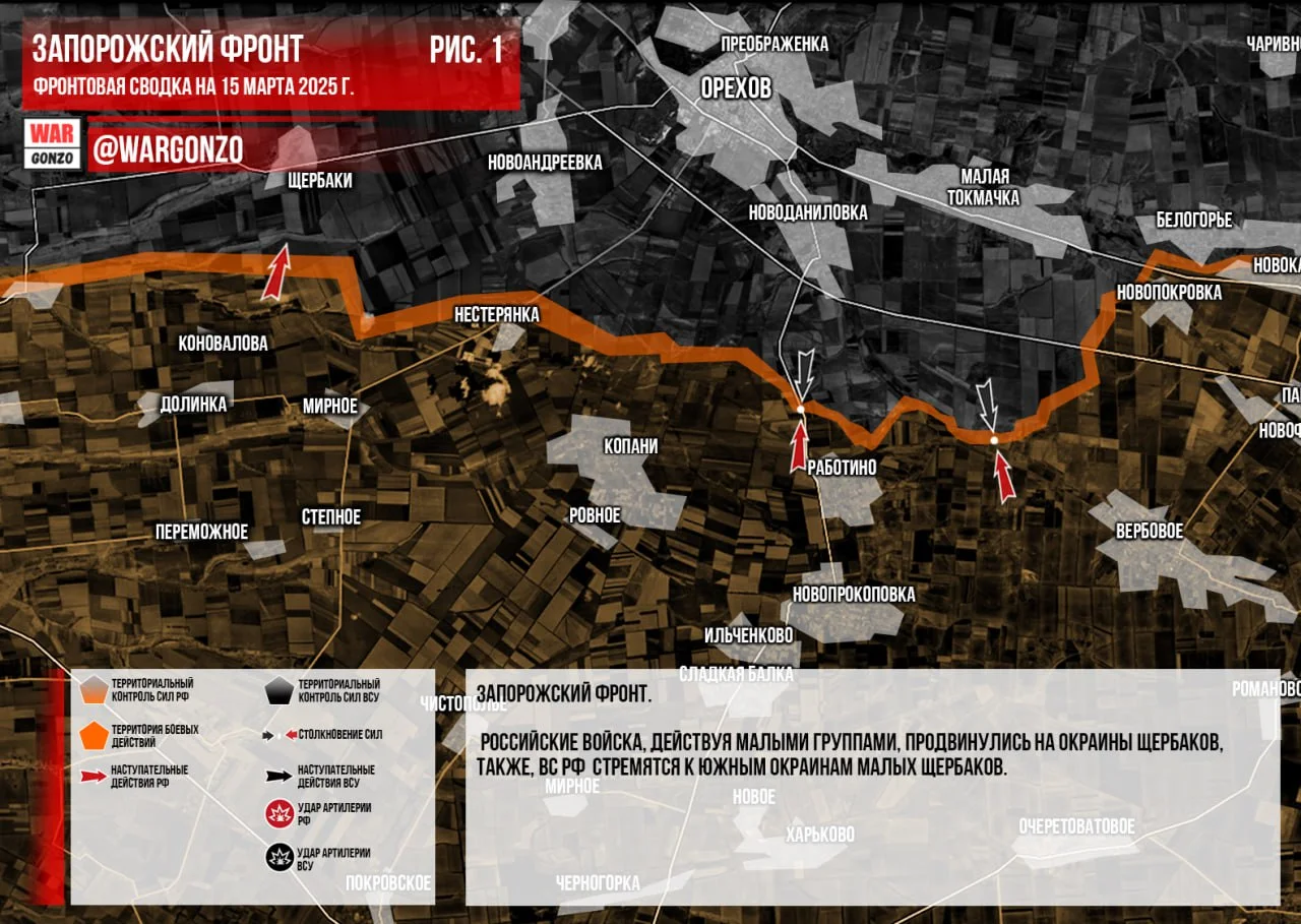 Запорожский фронт. Российские войска, действуя малыми группами, продвинулись на окраины Щербаков, также, ВС РФ стремятся к южным окраинам Малых Щербаков. (Рис.1)