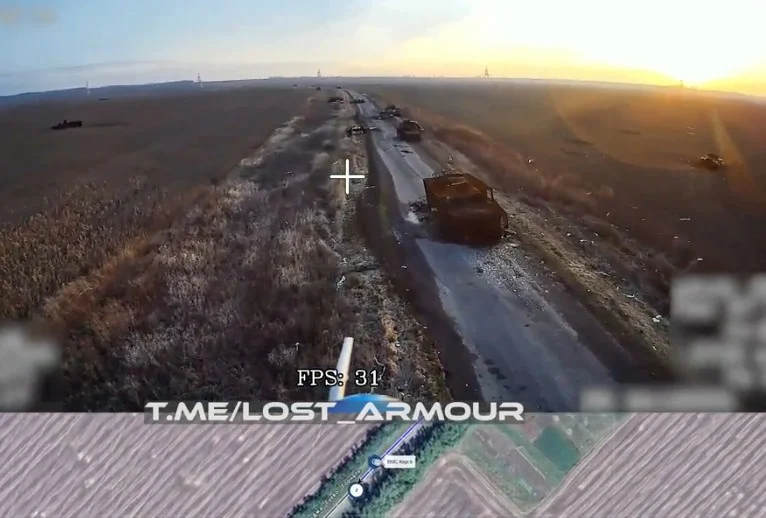 На видео разбитая колонна бронетехники ВСУ на трассе «Суджа-Гуево-Горналь» - одной из важнейших артерий снабжения группировки ВСУ в Курской области.