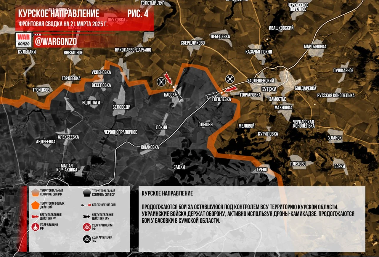 Курская область. Продолжаются бои за оставшуюся под контролем ВСУ территорию Курской области. Украинские войска держат оборону, активно используя дроны-камикадзе. Продолжаются бои у Басовки в Сумской области (Рис. 4)