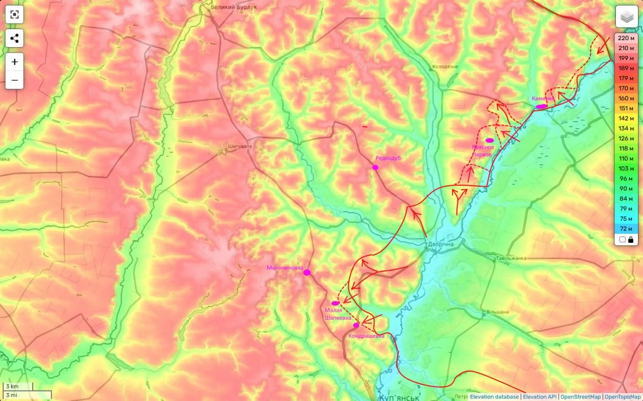 Наши штурмовики сумели выйти к трассе Каменка — Большой Бурлук, что является приговором гарнизону ВСУ в этом последнем оставшимся под контролем противника важным селом на западном берегу реки Оскол. Одновременно с этим наши части сумели взять под контроль высоты над Каменкой с северо-востока.